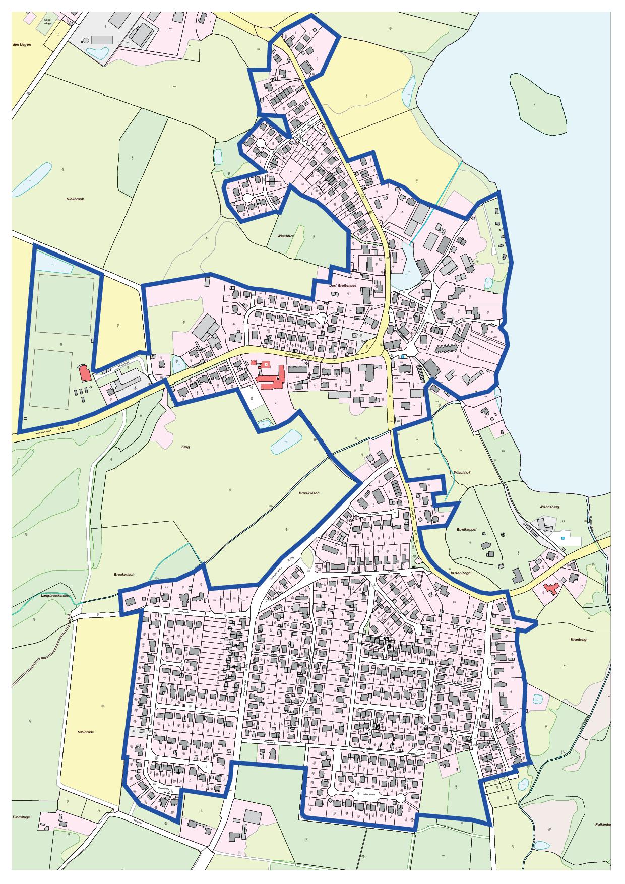 Von der Einführung der Niederschlagswassergebühr in der Gemeinde Großensee sind grundsätzlich alle Grundstücke betroffen, die innerhalb der blauen Umrandung des nebenstehenden Lageplanes gelegen sind. Alle Grundstücke die sich außerhalb dieser blauen Umrandung befinden, sind von der Maßnahme nicht betroffen!